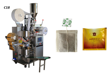 Model C18, our first set of tea bag packing machine for inner and outer tea bag packing with new Horizontal In-feeding Tag was developed and manufactured successfully in our company, which opened a new era for tea bag packing machine in this field.